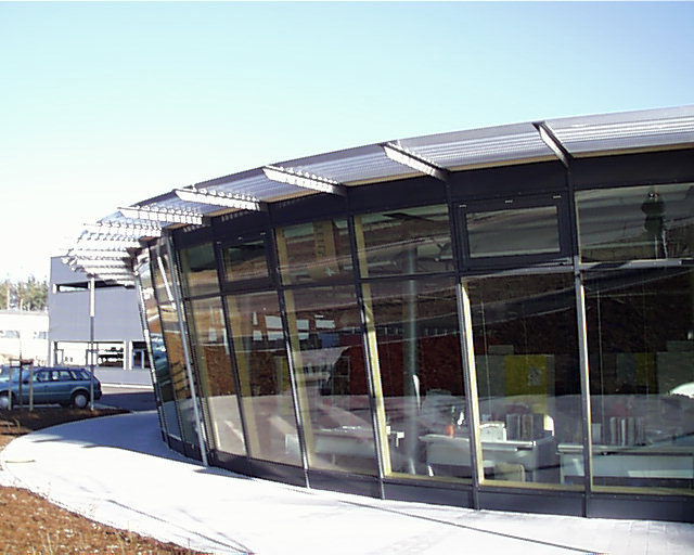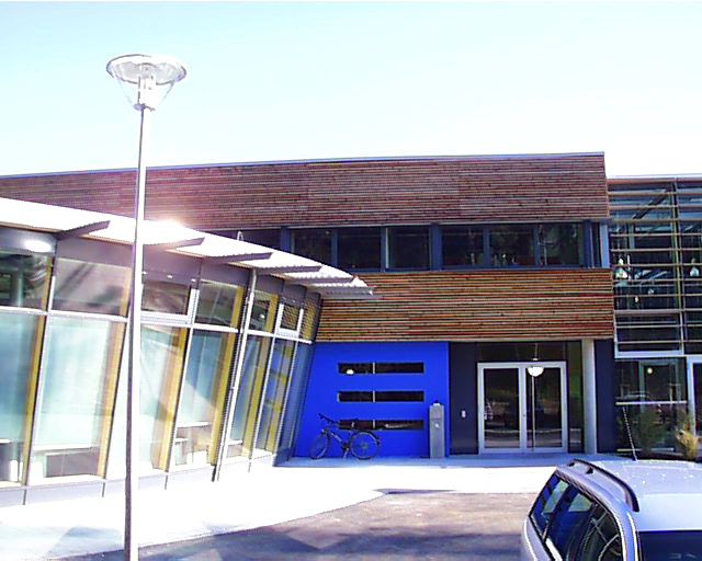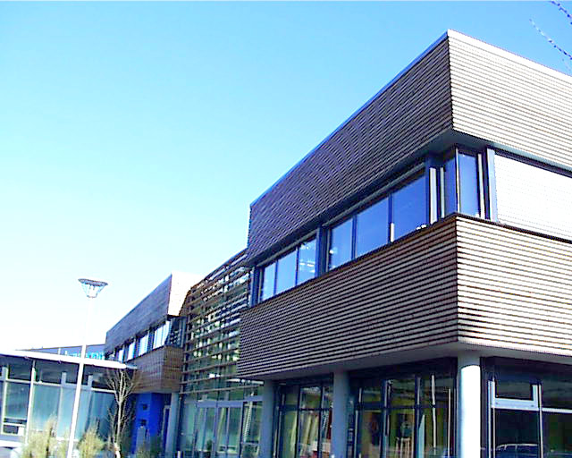 Dieses Firmengebäude fällt durch seine moderne Holzbekleidung an der Fassade auf. Ebenfalls markant ist der große Erker in Holz-Glas-Konstruktion, für den wir verantwortlich zeichnen.