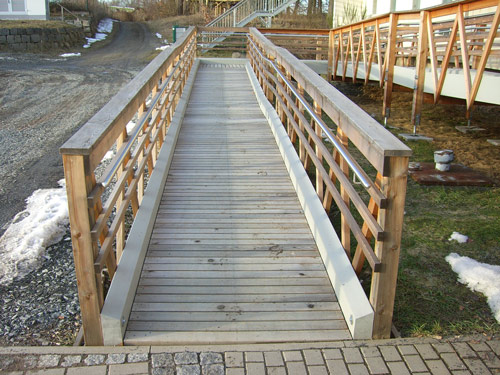 Um eine rollstuhlgerechte Neigung zu erzielen wurde die Rampe in zwei Teilstücken realisiert. Jedes Teilstück wiederum hat in der Mitte einen Teil mit geringerer Neigung, was die zu bewältigende Strecke noch einmal unterteilt.