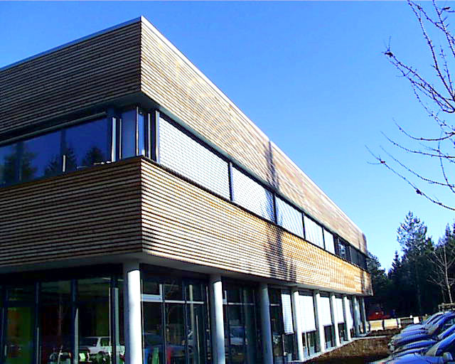 Dieses Firmengebäude fällt durch seine moderne Holzbekleidung an der Fassade auf. Ebenfalls markant ist der große Erker in Holz-Glas-Konstruktion, für den wir verantwortlich zeichnen.